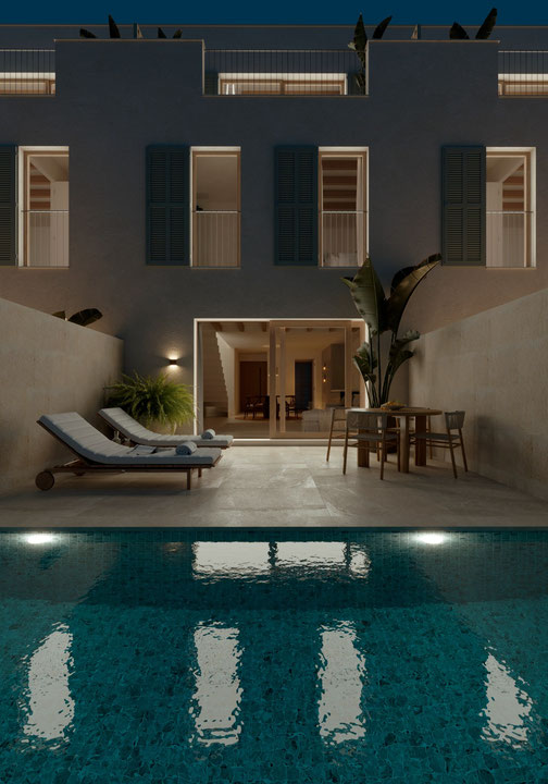 -Planta baja: Vestíbulo luminoso que conecta con un amplio cocina-comedor-estar, lavabo, sala de máquinas y patio exterior con piscina privada, ideal para disfrutar del sol mallorquín.